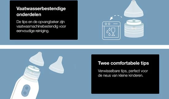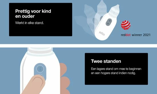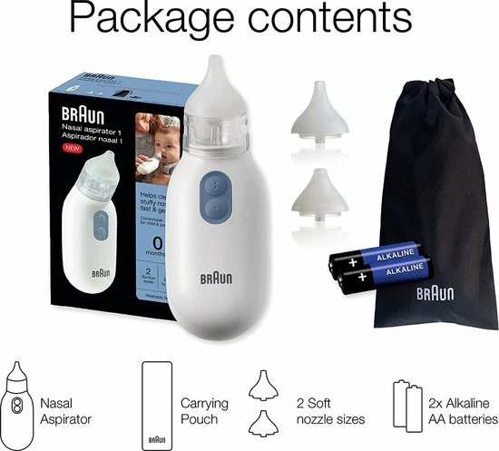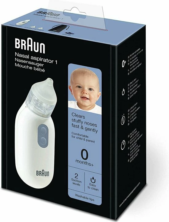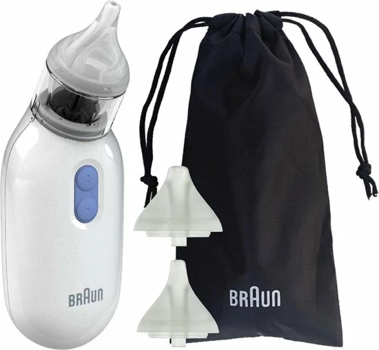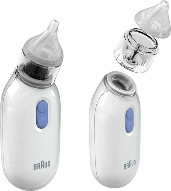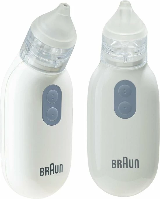 De Braun elektrische neusreiniger werkt als een kleine stofzuiger die slijm opvangt door te centrifugeren en beschikt over twee zuigstanden voor een stille en effectieve reiniging. Door de twee zuigstanden past de neusreiniger zich aan, aan de leeftijd van uw kind en aan de kwetsbaarheid van de neus. Dankzij de twee knoppen kunt u eenvoudig overschakelen naar een andere snelheid. De vorm van de neusreiniger zorgt ervoor dat het apparaat in elke richting gebruikt kan worden en stabiel in de palm van uw hand ligt tijdens het reinigen van de neus van uw kind. Er worden twee comfortabele en herbruikbare opzetstukken meegeleverd die passend zijn voor zowel baby?s als peuters. Deze opzetstukken en het reservoir kunnen na elk gebruik in de vaatwasser gereinigd worden.