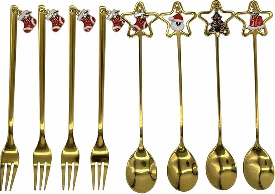 Een ideale bestekset van goudkleurige roestvrij stalen lepeltjes en vorkjes met verschillende figuurtjes. Prachtig om je gasten mee te onvangen voor de feestdagen om gezellig te genieten van een heerlijke dessert met een kopje warme thee of koffie.