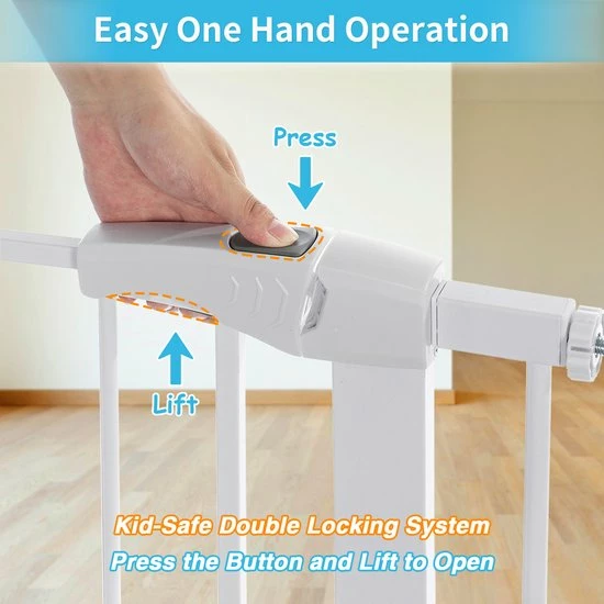 Stijlvol Metalen veiligheids deurhek van Comomy. Het klemhekje is eenvoudig door een volwassene met 1 hand te openen door de ergonomische handgreep. Het klemhekje kan naar 1 of 2 richtingen geopend worden voor optimale flexibiliteit. Het hekje past in openingen tussen 75 en 103 cm.