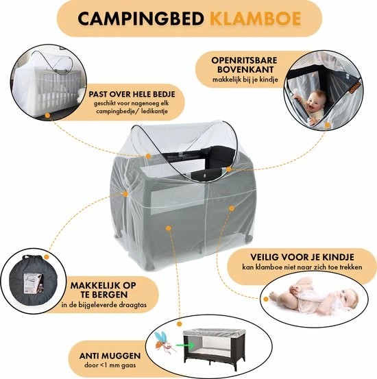 De klamboe maak je door middel van 4 klemmen vast aan de rand van het campingbed of ledikantje. De openritsbare bovenkant maakt het gemakkelijk om je kindje in bed te doen of uit bed te halen. De klamboe valt over het gehele bedje waardoor het elke zijde beschermt. Dankzij het