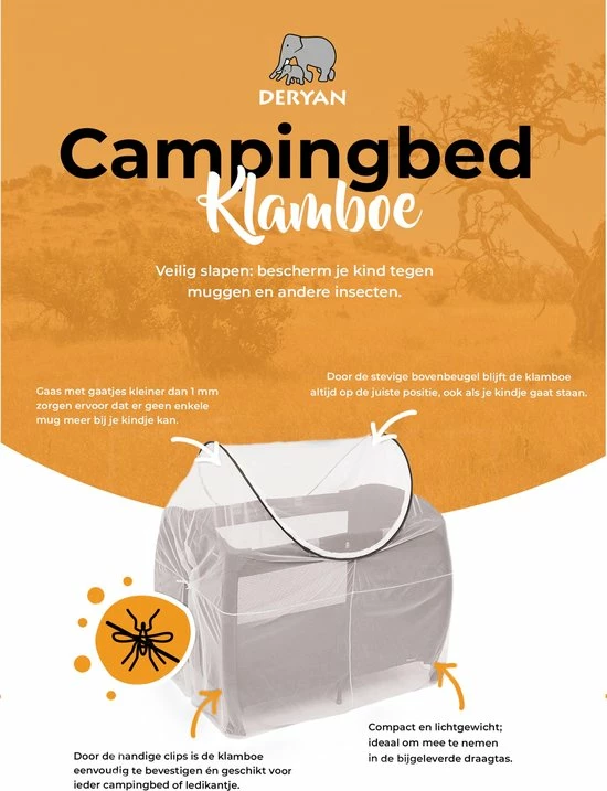 De DERYAN Campingbed Klamboe zorgt ervoor dat er geen muggen of andere insecten meer bij jouw kindje kunnen komen. Met het handige pop-up systeem is deze in een mum van tijd opgezet.