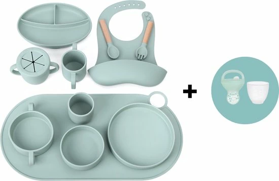 Is het bij jou thuis soms ook zo?n knoeiboel tijdens het eten? Je kindje leren eten kan soms een hele klus zijn. Deze 12-delige siliconen eetset helpt je kindje om netjes te leren eten. Het bordje met vakken en het kommetje met hoge rand zuigen vast aan de tafel of tafelblad (mits dit een glad oppervlak is). Hierdoor kunnen ze hun bordje niet meer zo makkelijk omstoten of omgooien.