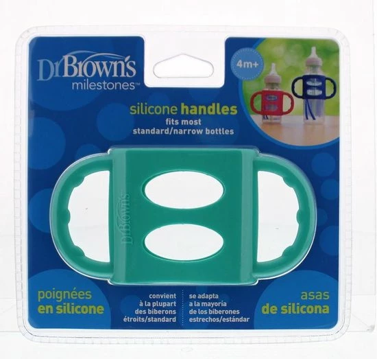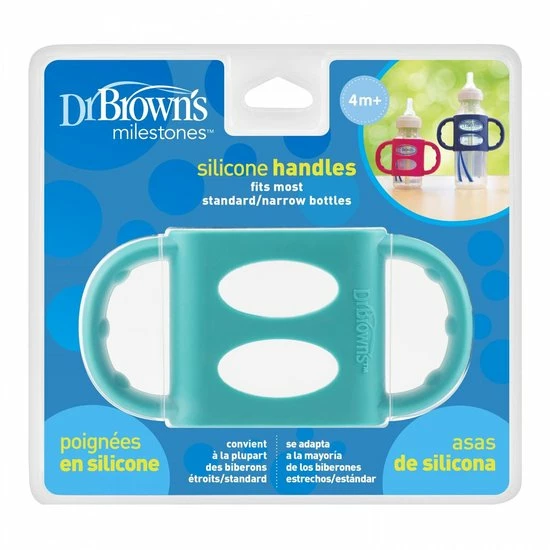 Handige Siliconen handvaten voor de standaard drinkflessen / Smalle hals van Dr. Brown’s Serie. Met deze siliconen handgreep voor de Smalle Hals Fles van Dr. Brown’s kan je kleintje gemakkelijk de fles zelf vasthouden! Dit stimuleert het zelfstandig drinken voor je kleintje én zorgt ervoor dat jij je handen vrij hebt.