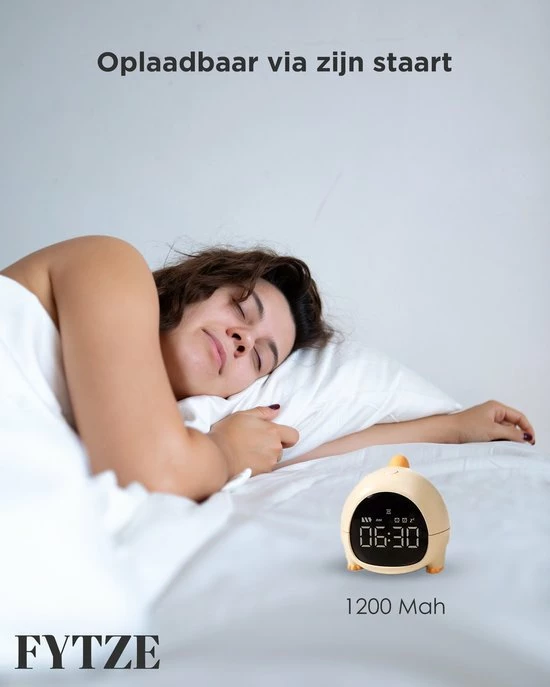 Hoe werken dit soort slaaptrainers precies? Als mama of papa kun je de tijd instellen die jij denkt dat goed is om wakker te worden op de FYTZE Sleep Trainer. Je kunt de slaaptrainer in de slaapkamer van je kind plaatsen, zodat hij of zij hem goed kan zien. Het display is ‘s nachts blauw en toont ook de maan. Dit is een teken dat uw kind in bed ligt. Is de tijd die je hebt ingesteld? De FYTZE Sleep Trainer springt dan naar een oranje scherm waar de zon te zien is. Tijd om wakker te worden! Zo kun je elk kind leren – ook als het de tijd nog niet weet – om langer in bed te blijven, waardoor je meer slaap krijgt. De slaaptrainer is draadloos en oplaadbaar. We bieden een micro-USB-kabel die u kunt gebruiken om hem op te laden. De helderheid van het scherm is in 7 standen in te stellen. Je kunt hem dus ook als nachtlampje gebruiken als je wilt. Ten slotte is de FYTZE ook een wekker met een wekker.