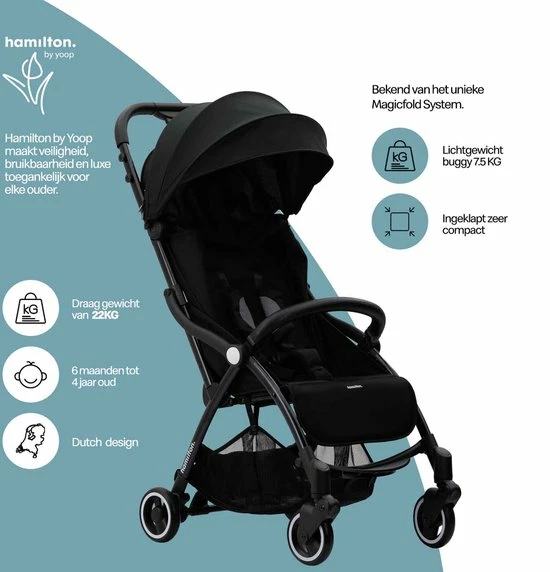 Hamilton by Yoop maakt comfort, veiligheid en design toegankelijk en betaalbaar voor iedere ouder. De luxe plooibuggy is zorgvuldig ontworpen voor kinderen vanaf 6 maanden tot 4 jaar oud en 22 kilogram. De lichtgewicht Hamilton kinderwagens staan bekend om het unieke Magicfold Systeem, het compacte reisformaat en de zeer veilige, comfortabele en gebruiksvriendelijke eigenschappen.