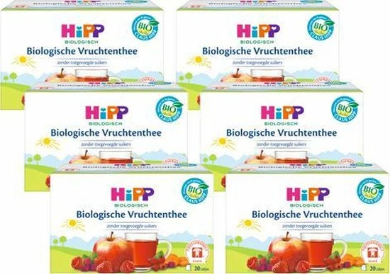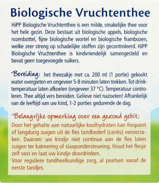 HiPP Biologische Vruchtenthee is een milde, smakelijke thee voor het hele gezin. Deze bestaat uit biologische appels, biologische rozenbottel, fijne biologische wortel en biologische frambozen, welke zeer streng op schadelijke stoffen zijn gecontroleerd. HiPP Biologische Vruchtenthee is kindvriendelijk samengesteld en bevat geen toegevoegde suikers.