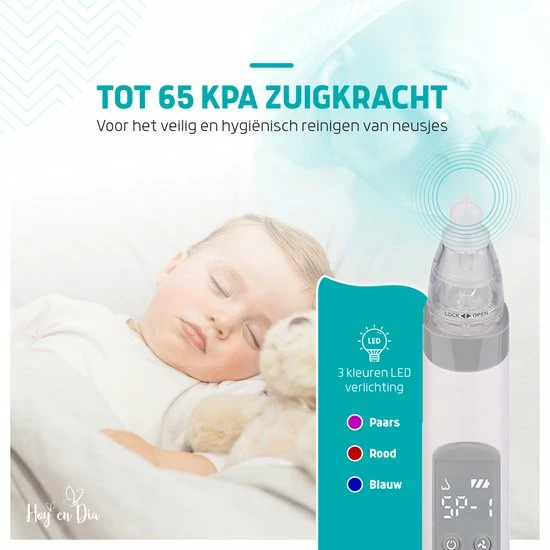 De elektrische neusreiniger van Hoy en Dia is speciaal ontworpen voor pasgeboren baby’s, peuters en kleuters tot 6 jaar. Dit houdt in dat de zuigkracht sterk genoeg is (maximaal 65Kpa) om het loslopende neusslijm te verwijderen en het geen kwaad kan doen aan een baby en kinderneusje. Wij garanderen u een veilig en hygi?nisch artikel voor het reinigen van baby en kinderneusjes. Voor vragen staan wij altijd tot uw beschikking.