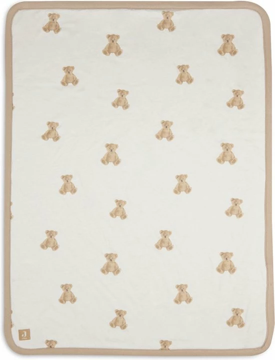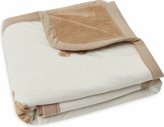 Deze deken heeft een Ivory ondergrond en de beertjes op de print hebben de kleuren Biscuit en Chestnut. De achterkant van het dekentje is gemaakt van fleece in de kleur Biscuit.