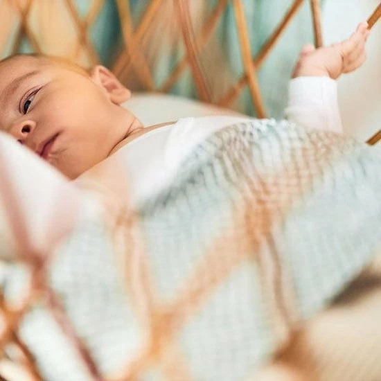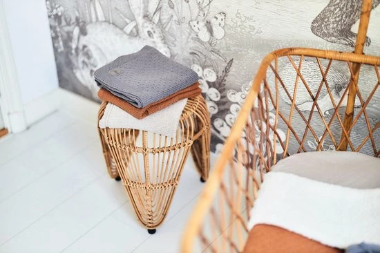 In negen effen kleuren verkrijgbaarJe kunt kiezen uit zacht roze, Nougat (creme), Ash Green, Storm Grey (donker grijs), Soft Grey (licht grijs), zwart, karamel bruin, helder geel en mosterdgeel. Daar zit vast een kleur tussen die matcht met de lakens en het interieur van de babykamer.