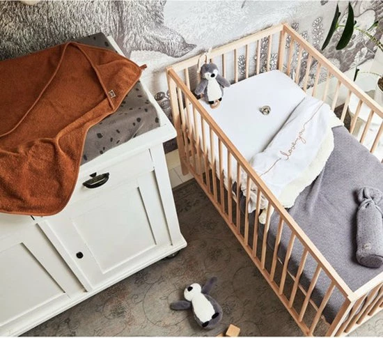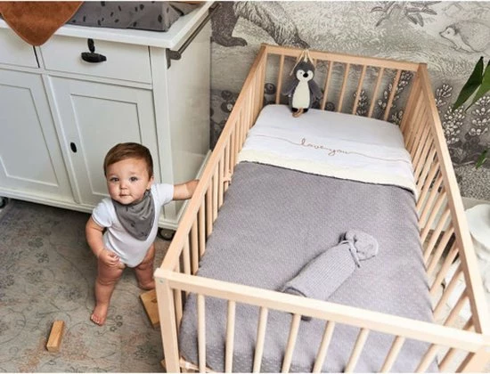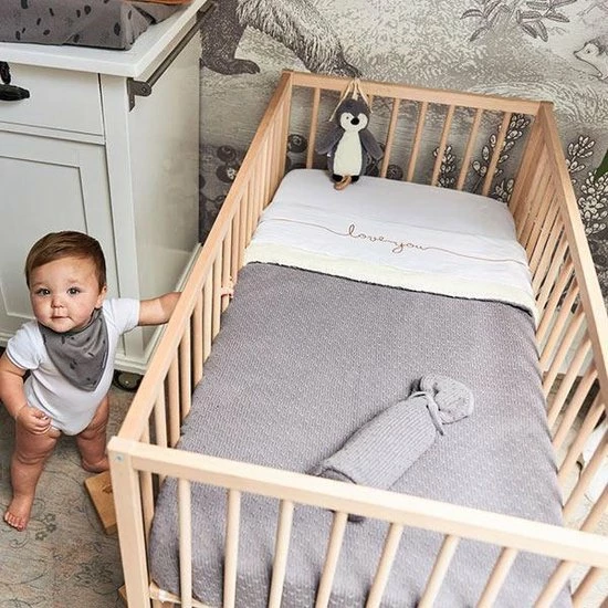 Het laken past met afmeting 120x150cm in een ledikantje. Het is ook in kleiner formaat verkrijgbaar voor wieg en kinderwagen.