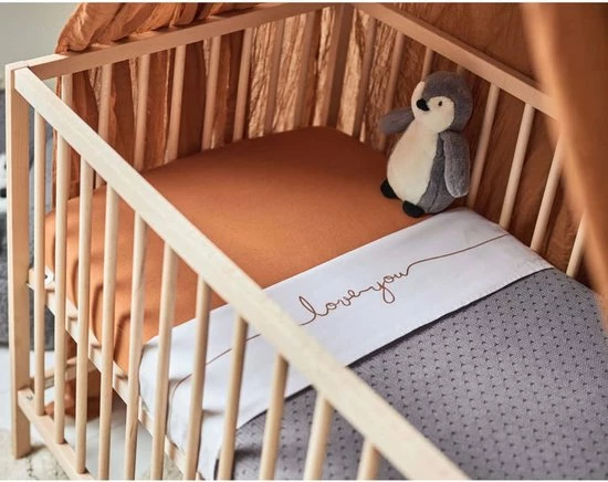 Met een wit lakentje kun je het bedje van jouw baby veilig, kort en strak opmaken. Door de zijkanten van het lakentje onder het matrasje te stoppen, slaapt jouw kleintje niet alleen veilig, maar heeft het ook een geborgen gevoel. Dit lieve lakentje met de tekst ‘love you’ past perfect bij de dekens uit het Basic knit thema en het Bliss knit thema van Jollein.