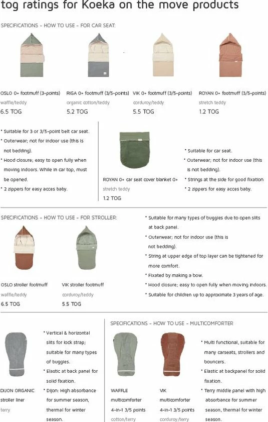 Wij snappen dat het lastig kan zijn om de perfecte voetenzak te vinden. Het is belangrijk om rekening te houden met de cumulatieve TOG waarde van de producten die je voor je kindje gebruikt. Tussen de afbeeldingen staat een overzicht met de verschillende TOG waarden van de Koeka outdoor producten. Bedenk dat wanneer de outdoor producten in een indoor situatie gebruikt worden, bijvoorbeeld buiten of in een winkelcentrum, rekening moet worden gehouden met de binnen temperatuur. Open de rits van de voetenzak of doe een laagje kleding uit zodat je kindje het niet te warm krijgt. Deze voetenzak past in bijna elke buggy. Om te kijken of de voetenzak in jouw buggy past, heeft Koeka een ?fitting overview? samengesteld. Deze keuzehulp vind je tussen de afbeeldingen.