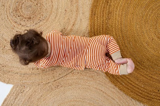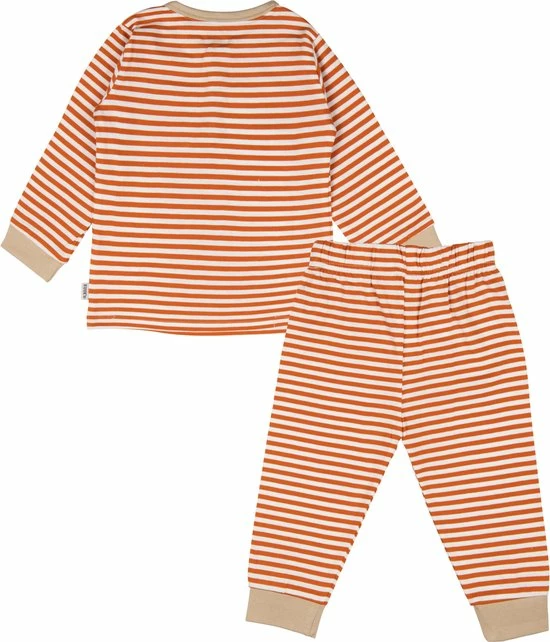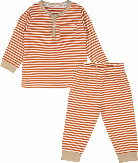 Deze vrolijke unisex pyjama van Kuuk?n heeft een top met lange mouwen en een lange broek. Zowel de top als de broek hebben zand kleurige contrast boorden. De pyjama is gemaakt van een zachte katoenen stof en heeft een sunset orange met offwhite streepje. Het pyjama broekje heeft een elastische tailleboord en het jasje een polo voorsluiting.