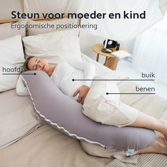 Tijdens de zwangerschap verandert er fysiek en emotioneel veel in het lichaam, hierdoor is er behoefte aan rust en steun, het lichaam veranderd en hoe verder de maanden vorderen wordt het lichaam steeds meer belast. Belangrijk is dan om van een optimale nachtrust te kunnen genieten. Door de J vorm van dit kussen wordt ??n zijde van het lichaam volledig van steun voorzien, klachten als benauwdheid en maagzuur worden hierdoor geremd. Niet alleen voor de zwangere geeft het kussen de ideale ondersteuning, door de vormgeving van het kussen wordt ook de baby gestimuleerd om een prettige houding in de baarmoeder aan te nemen.