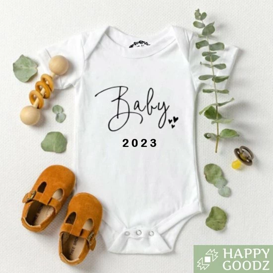 Deze romper is gemaakt van een 100% katoen met de opdruk ‘baby 2023 en aan de binnenkant bedrukt: Geluk zit in een klein rompertje’. Deze goed ademende stof is ideaal voor je kleintje.