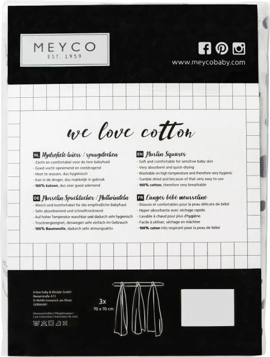 De hydrofiele luiers zijn 70×70 cm en verkrijgbaar in diverse kleuren. Dankzij de rustige tinten, combineer je de hydrofiele luiers ook perfect met de complete collectie van Meyco Baby. Deze set bestaat uit drie hydrofiele luiers.