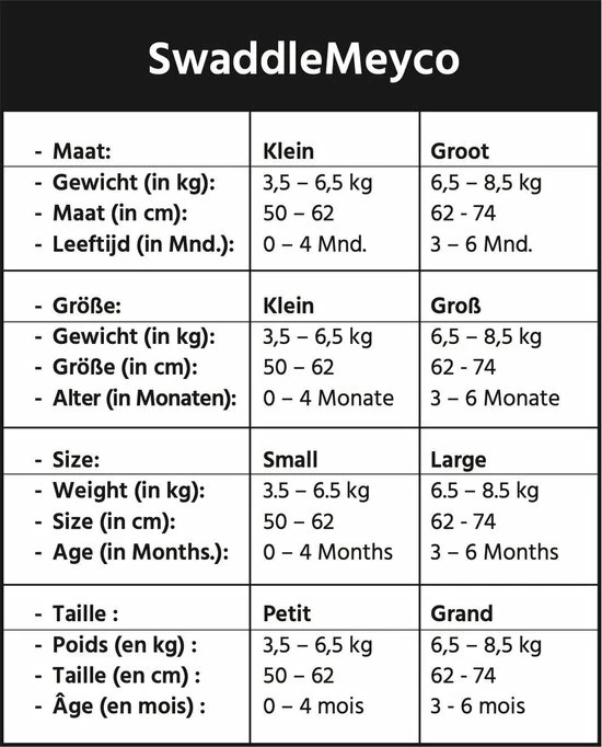 De SwaddleMeyco inbakerdoek is verkrijgbaar in verschillende maten: