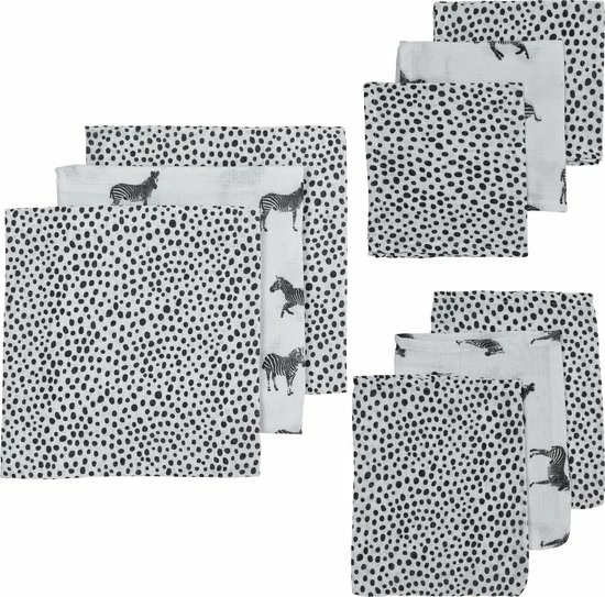 Met deze complete Meyco Baby Hydrofiele Starterset 9-delig Zebra Animal/Cheetah is je hydrofiele babyuitzet in ??n klap klaar. De set bestaat uit hydrofiele luiers, monddoekjes en washandjes met een print van schattige zebra?s ?n van de populaire cheetah print.