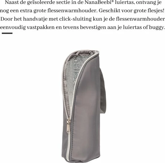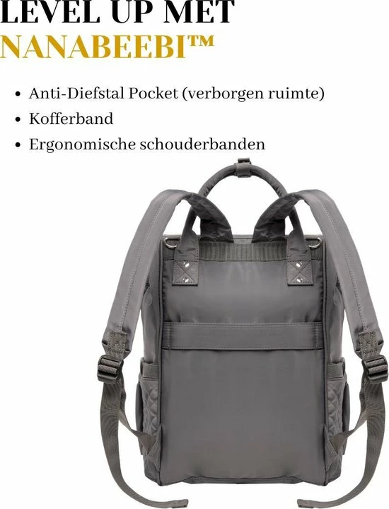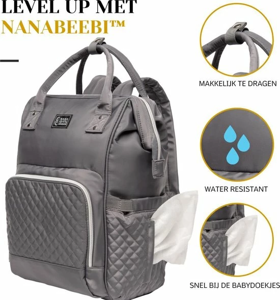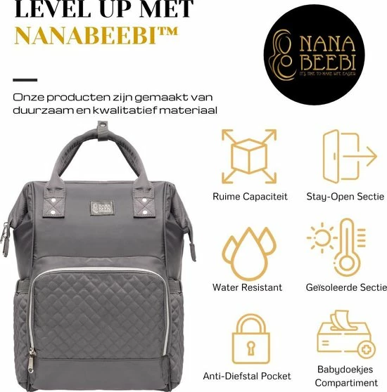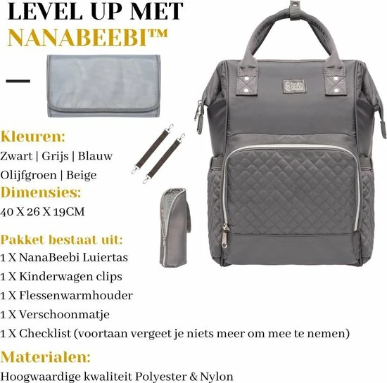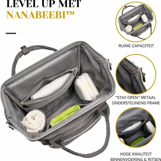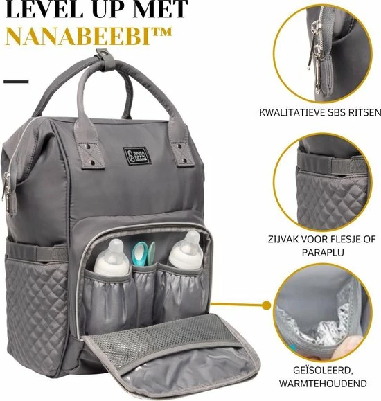 De makers van NanaBeebi hebben goed rekening gehouden met de kwaliteit. NanaBeebi is gemaakt door ouders voor ouders. Een betrouwbare Nederlandse merk luiertas die voldoet aan alle Europese kwaliteitsnormen. Deze verzorgingstas beschikt over een fijne afwerking en stevige naden voor een langere levensduur. Daarnaast beschikt deze luiertas over unieke ?sbs? ritsen, een kwalitatieve ritsafsluiting waardoor de ritsen niet afbreken bij regelmatig gebruik. As je eenmaal een luiertas koopt, wil je deze de hele baby- en peuterperiode gebruiken!