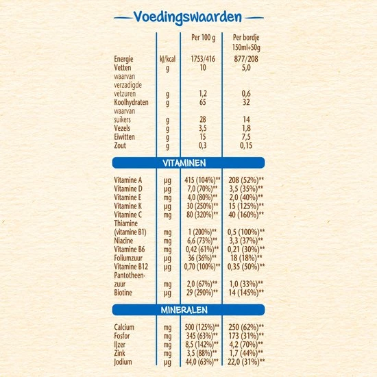 | Voedingswaarde | Soort, Per, 100, Gram., Energie, 1753, kJ, (416, kcal), Vet, 10, g, Waarvan, verzadigd, 1.2, g, Koolhydraten, 65, g, Waarvan, suikers, 28, g, Voedingsvezel, 3.5, g, Eiwitten, 15, g, Zout, 0.3, g, Vitamine, A, 415, ?g, Vitamine, D, 7, ?g, Vitamine, E, 4, mg, Vitamine, K, 30, ?g, Vitamine, C, 80, mg, Vitamine, B1, /, Thiamine, 1, mg, Vitamine, B3, /, Niacine, 6.6, mg, Vitamine, B6, /, Pyridoxine, 0.42, mg, Vitamine, B11, /, Foliumzuur, 36, ?g, Vitamine, B12, /, Cyano-cobalamine, 0.7, ?g, Vitamine, H, /, Biotine, 29, ?g, Vitamine, B5, /, Pantotheenzuur, 2, mg, Calcium, 500, mg, Fosfor, 345, mg, IJzer, 8.5, mg, Zink, 3.5, mg, Jodium, 44, ?g |
