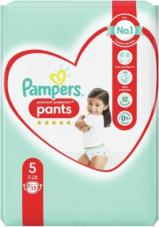 Pampers Premium Protection Pants 5 zorgen voor een optimaal comfort en een perfecte bescherming van uw kleintje. Deze superabsorberende pants sluiten perfect aan door hun driezijdige pasvorm. Hun ontwerp beschermt uw liefste schat tot wel 12 uur lang tegen urine of andere lekken. Deze kinderdoeken hebben een extra lange absorptielaag of patch. Pampers Premium Protection zijn bovendien extra ademend.Deze vederzachte pants dragen bij tot een diepe slaap en bezorgen u en uw bengel een comfortabele en droge nachtrust. Deze Pants werden ontwikkeld uit een zeer fijn en flexibele materiaal. Op die manier worden de beentjes en de billetjes van uw allerliefste ontlast en kunnen ze in alle vrijheid bewegen. Het vocht van uw kind wordt door het absorberend vermogen van deze luier diep in de kern opgevangen zodat er geen irritatie van de kwetsbare babyhuid kan optreden. Deze aangename pants geven uw baby een knus en veilig gevoel, zodat u en uw kindje op beide oren kunnen slapen!Deze pants zijn geschikt voor baby’s van 12 tot 17 kg.