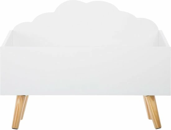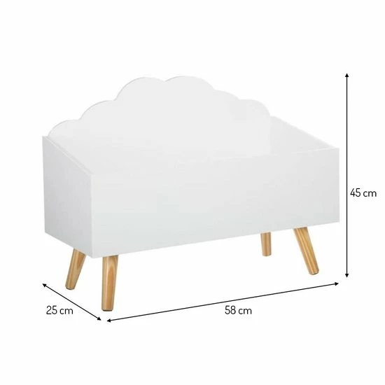 De wolkvormige speelgoedkist van Eazy Living is geschikt voor het opbergen van alle soorten speelgoed, boeken, knuffels,… Door de grote capaciteit kunnen er flink wat spullen in opgeborgen worden. De 4 houten poten zorgen voor de stevigheid van de kist. Afmetingen: 58 x 28 x 45 cm