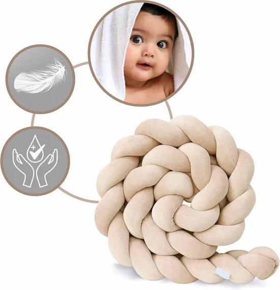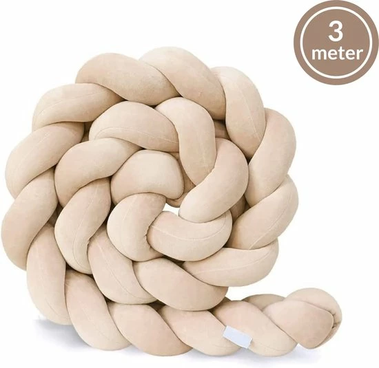 Met onze XL bedbumper van 3 meter slaapt je baby in stijl, veilig en comfortabel. Voorkom dat je baby zich tegen de randen van het bedje, de box of ledikant stoot. Daarnaast voorziet deze bedomrander je baby van geborgenheid en houdt het tevens de tocht buiten het bedje. Deze gevlochten bedbumper is beige van kleur, gemaakt van 100% katoen en past in elk interieur.