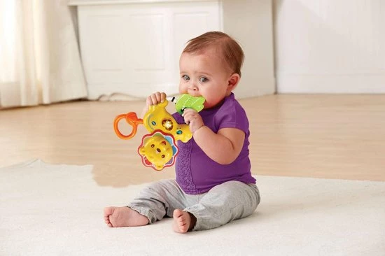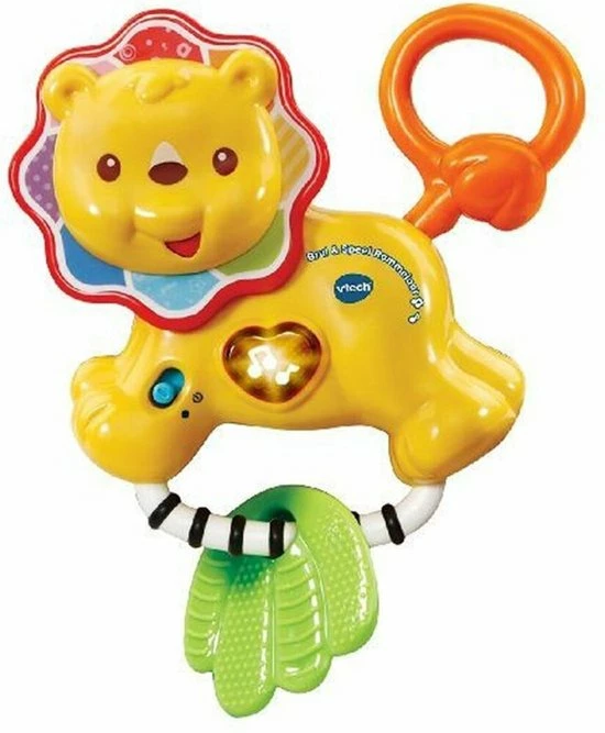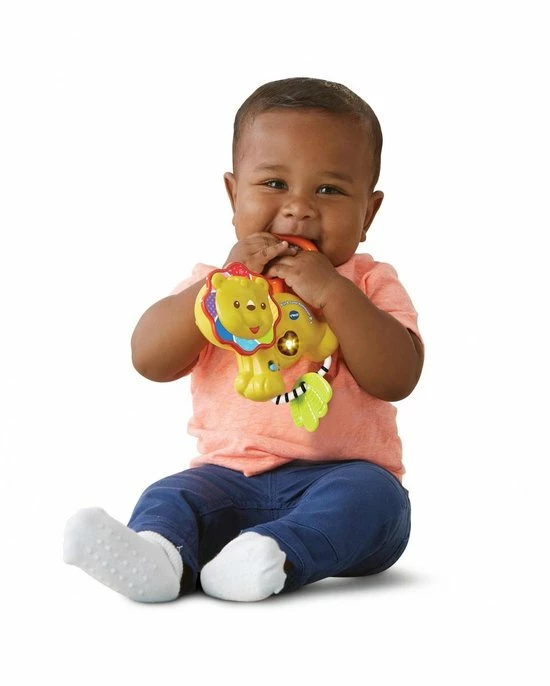 Schud het leeuwtje of draai de manen voor vrolijke reacties! Druk op de knipperende hart-toets om grappige geluiden, vrolijke zinnetjes, gezongen liedjes en melodietjes te horen. De blad-bijtring verlicht de pijn bij het doorkomen van de tandjes.